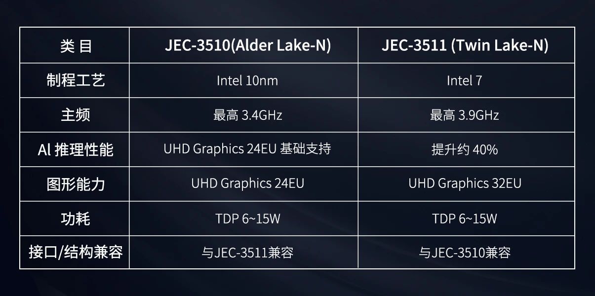 相較前代主力機型JEC-3510,JEC-3511支持PIN對PIN兼容,實現(xiàn)零成本替換升級,助力用戶在工業(yè)自動化、邊緣AI、工業(yè)網關等應用場景中輕松完成性能躍遷。