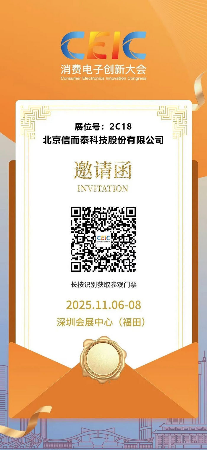 北京信而泰科技股份有限公司誠摯邀請您蒞臨 2025消費(fèi)電子創(chuàng)新大會(CEIC 2025) ,與我們共同探索消費(fèi)電子領(lǐng)域的前沿技術(shù)與創(chuàng)新應(yīng)用。本次大會將于 2025年11月6日至8日 在 深圳會展中心(福田)2號館 隆重舉行,我司展位號為 2C18,期待與您相見!