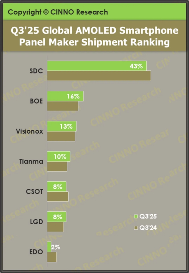 柔性AMOLED已成為智能手機面板市場的絕對主力,第三季度在全球AMOLED市場中占比突破80%。這一技術(shù)趨勢正推動全球顯示產(chǎn)業(yè)格局的重構(gòu):韓國廠商份額同比下滑至43.8%,而國內(nèi)廠商則以56.2%的份額實現(xiàn)反超。