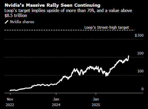 Loop Capital Markets周一將英偉達目標(biāo)股價從250美元上調(diào)至350美元,為華爾街當(dāng)前最高預(yù)測。這一新目標(biāo)相較于英偉達最新收盤價202.49美元高出逾70%,對應(yīng)的市值將超過8.5萬億美元。當(dāng)前市場對英偉達的平均目標(biāo)價為231美元。