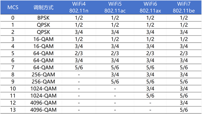 指調(diào)制子載波的方式。由于一個(gè)子載波承載一個(gè)Symbol,編碼方式代表著一個(gè)Symbol能承載的bit數(shù)量,常見編碼方式有BPSK、QPSK、QAM。根據(jù)以下數(shù)據(jù)得到WiFi7編碼方式目前最大12bit/Symbol。