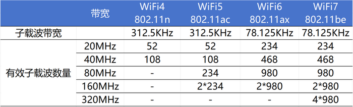子載波是用于數(shù)據(jù)傳輸?shù)念l域信號,是頻域資源的一部分,不同調(diào)制方式及不同頻寬下的子載波數(shù)量不一樣,和帶寬以及每個(gè)子載波的帶寬相關(guān)。根據(jù)以下數(shù)據(jù)得到WiFi7有效子載波數(shù)量最大3920(4*980)。