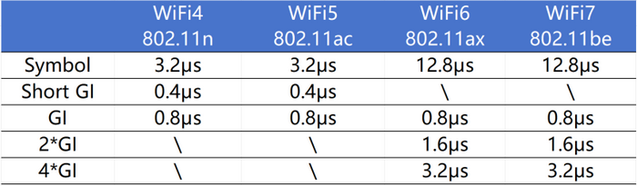 符號時(shí)間是Symbol時(shí)間與GI時(shí)間相加的和。Symbol表示一次傳輸?shù)臄?shù)據(jù),是時(shí)域上的傳輸信號;GI是相鄰的兩個(gè)Symbol之間的時(shí)間空隙,以避免 Symbol 之間相互干擾。根據(jù)以下數(shù)據(jù)得到WiFi7最小符號時(shí)間是13.6us(12.8us+0.8us),也即0.0000136s。