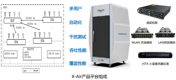 X-Air旨在實(shí)驗(yàn)室環(huán)境下構(gòu)建高度貼合真實(shí)場景的測試條件,實(shí)現(xiàn)多用戶、多角度、全覆蓋的自動化測試。該平臺可廣泛應(yīng)用于 WLAN 相關(guān)產(chǎn)品的研發(fā)測試、質(zhì)檢測試、抽樣入庫測試及外場驗(yàn)收測試階段,通過精準(zhǔn)構(gòu)建信道模型、用戶流量模型與干擾用戶流量模型,為 WiFi 服務(wù)及設(shè)備性能測試提供高效、準(zhǔn)確的解決方案,助力企業(yè)驗(yàn)證設(shè)備在復(fù)雜無線環(huán)境下的性能與穩(wěn)定性。