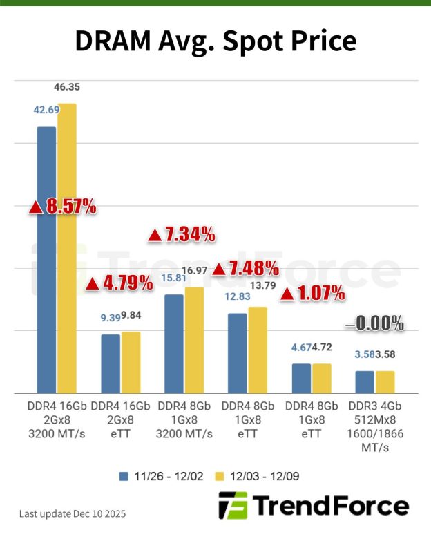 在 DRAM 市場方面,DDR5 與 DDR3 在過去幾周經(jīng)歷快速拉升后,本周迎來溫和回調(diào),主要來自部分現(xiàn)貨交易商的年底獲利了結(jié)操作。不過,這一調(diào)整并未改變整體供應(yīng)緊張的市場格局。