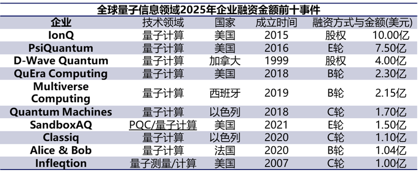 3. 2025 年量子信息領(lǐng)域市場投融資熱度高漲。近十年,全球量子信息領(lǐng)域產(chǎn)業(yè)投融資事件達 1400 余筆,融資金融超 145 億美元,其中風(fēng)險投資占比約 67%。今年量子計算明星企業(yè)成為資本市場的追捧熱點,歐美量子企業(yè)在前十融資事件中占據(jù) 8 席,另外 2 家以色列量子計算企業(yè)和歐美生態(tài)系統(tǒng)聯(lián)系緊密。