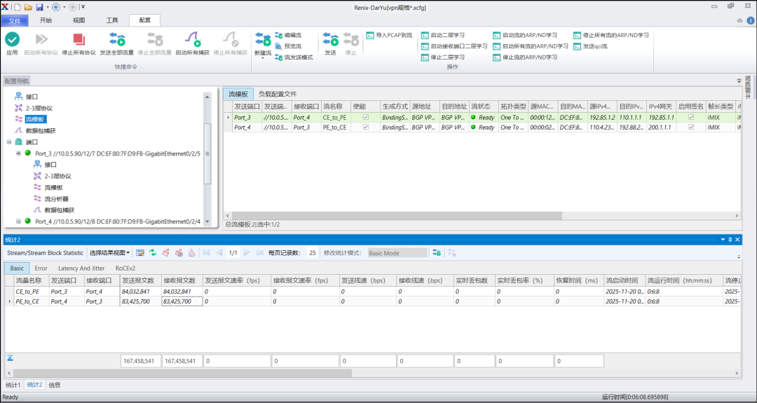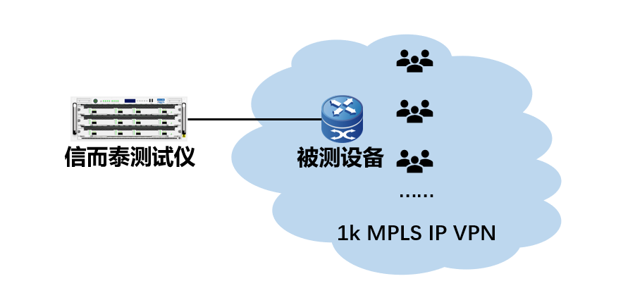 搭建簡化的測試場景,在一對端口上模擬測試1000個MPLS IP VPN,每VPN通告100條VPNv4路由,并震蕩其中10%路由。發(fā)送iMIX流量驗證VPN轉(zhuǎn)發(fā)能力。
