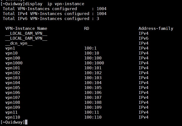 在DUT上檢查,共1000個VPN數(shù)量、VPN中通告100條私網(wǎng)路由,VPN路由總數(shù);