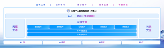 天禧AI由AUI、天禧大腦、天禧生態(tài)和可信安全平臺(tái)構(gòu)成,擁有感知、理解、記憶、規(guī)劃、調(diào)度五大能力。天禧AI 3.5實(shí)現(xiàn)了“三大飛躍”:首先是個(gè)性化飛躍,依托“全時(shí)空主動(dòng)記憶”技術(shù),結(jié)合全域知識(shí)庫(kù),生成因人而異的個(gè)性化答案;第二是行動(dòng)力飛躍,通過(guò)超級(jí)智能體工作群,實(shí)現(xiàn)多智能體協(xié)同,如AI播客、ChatExcel、超級(jí)互聯(lián)3.0都是其代表應(yīng)用;第三是交互體驗(yàn)飛躍,天禧AI 3.5具備多端協(xié)同感知,統(tǒng)一的AUI,讓用戶獲得始終如一的智能體驗(yàn)。