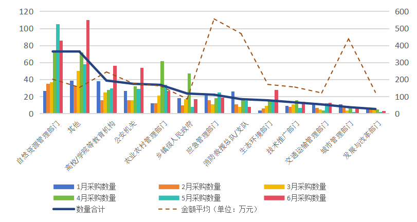 上半年公開投資采購市場整體呈現(xiàn)上升趨勢,自然資源管理和應(yīng)急管理部門采購需求最為旺盛。上半年公開采購累計發(fā)生1830起,已披露總金額達(dá)到39億元。其中五月采購金額位居榜首,占上半年全部采購金額的25%。自然資源管理部門和應(yīng)急管理部門上半年共計采購13億元,采購金額位居前二。此外,應(yīng)急管理、消防救援、城市管理等部門財力雄厚,平均采購金額位居前三。