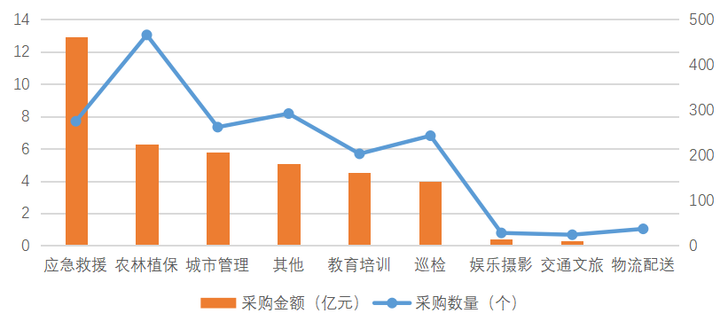 應(yīng)急救援和農(nóng)林植保是目前發(fā)展較為成熟的場景,應(yīng)急救援類相對單價更高。農(nóng)林植保上半年采購數(shù)量最多,共發(fā)生466起;應(yīng)急救援類場景采購金額最多,超12億元,其中無人機或直升機以及配件等硬件金額占比達(dá)90.6%。以政府主導(dǎo)的公共服務(wù)類場景如應(yīng)急救援等大單相對集中,與政策補貼資金流向相同,如應(yīng)急部門上半僅發(fā)生110次采購,平均每筆采購事件達(dá)到555萬元。行業(yè)類采購如農(nóng)林植保高頻小單較多,部分農(nóng)業(yè)公司提供防治等服務(wù),服務(wù)價格相對采購更低,依據(jù)防治面積定價(目前單價≤20元/畝)或隨采購農(nóng)藥產(chǎn)品搭售。