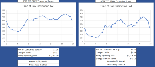 O-RU是接入網(wǎng)中功耗最高的組件。不過(guò),可以通過(guò)多種手段實(shí)現(xiàn)節(jié)能,例如可變時(shí)鐘、動(dòng)態(tài)功率放大器偏置、小區(qū)和載波關(guān)閉、射頻信道重新配置、睡眠模式、間斷收發(fā)等。隨著RAN的分解,需要明確各組件特性,以全面了解系統(tǒng)和網(wǎng)絡(luò)層面的權(quán)衡。圖5對(duì)比展示了啟用和未啟用微睡眠模式時(shí),O-RU站點(diǎn)在24小時(shí)內(nèi)的功耗以及潛在的節(jié)能效果。