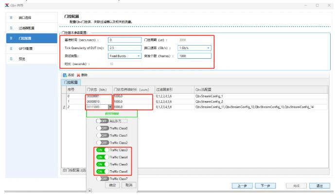 門控中依次添加三個GCL列表項(xiàng),門狀態(tài)中指定門狀態(tài),0為關(guān)門,1為開門。列表0放行優(yōu)先級0流量、列表1放行優(yōu)先級1流量、列表2放行3、4、5、6優(yōu)先級流量。門狀態(tài)持續(xù)時長設(shè)置每個列表的持續(xù)時間,所有列表持續(xù)時間之和為Oper Cycle Time此例設(shè)置每個GCL持續(xù)時間為1ms,Oper Cycle Time為3ms;過濾器索引為測試儀統(tǒng)計(jì)不同GCL放行流量的落點(diǎn)情況。(門控規(guī)則與DUT保持一致)