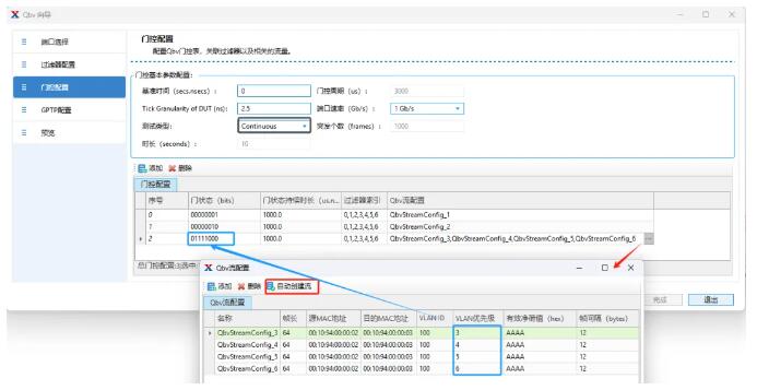 配置Qbv流量,點(diǎn)擊自動創(chuàng)建流量會自動生成對應(yīng)優(yōu)先級的Qbv流,也可以點(diǎn)擊“添加”手動創(chuàng)建其他流量,配置測試類型為Continuous。