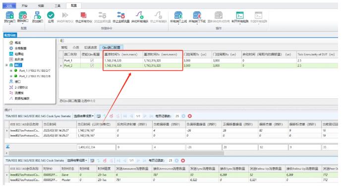 配置AS協(xié)議并點(diǎn)擊完成,在配置導(dǎo)航欄中可看到生成的AS協(xié)議,點(diǎn)擊啟動所有協(xié)議,能看到測試儀Telkerd端口AS時鐘狀態(tài)為Slave,Listener端口AS時鐘狀態(tài)為Master,統(tǒng)計(jì)中能看到時間偏移量及協(xié)議包交互數(shù)量均正常,時間同步是Qbv調(diào)度基準(zhǔn)時間的基石,需優(yōu)先確保其建立成功。