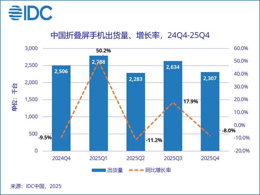 在折疊屏手機(jī)細(xì)分市場(chǎng),2025 年第四季度出貨量為 231 萬臺(tái),同比下降 8.0%,市場(chǎng)呈現(xiàn)階段性回調(diào)。全年折疊屏手機(jī)出貨量約 1001 萬臺(tái),同比增長(zhǎng) 9.2%,但增速已有所放緩。