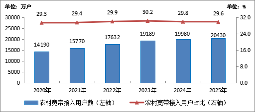 圖2-4  2020—2025年農(nóng)村寬帶接入用戶及占比情況