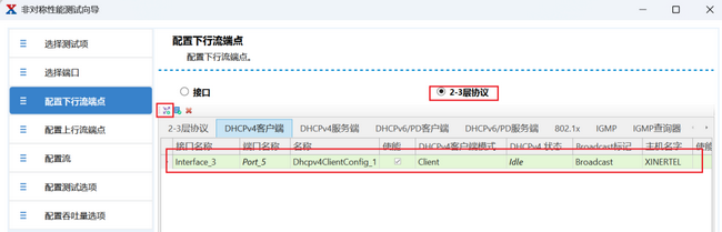 在這里也可以設置L23協(xié)議接口,例如DHCPv4,模擬用戶PC獲得DHCPv4地址后使用DHCPv4地址作為端點(IPv6/雙棧用戶都支持)。大多數情況下,上行流端點是模擬下掛在ONU用戶側的PC,這個方向使用DHCPv4/v6接口或雙棧。下行流端點模擬的OLT上聯設備,這個方向一般使用V4/V6接口。