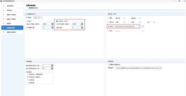 測試向導提供四類測試選項,本次重點選擇 “非對稱吞吐量測試”(測試結果將同步統(tǒng)計吞吐量、時延及抖動數據),其余選項可根據需求靈活勾選: