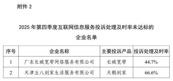 在互聯(lián)網信息服務投訴方面,2025年第四季度,互聯(lián)網信息服務投訴平臺收到的互聯(lián)網用戶投訴中,服務功能類投訴占比46.2%,個人信息保護類投訴占比18.6%,客服渠道類投訴占比15.5%。在178家頭部互聯(lián)網企業(yè)中,廣東長城寬帶、天鵝到家等2家企業(yè)投訴處理及時率較低,已督促相關企業(yè)妥善處理用戶反映的問題。