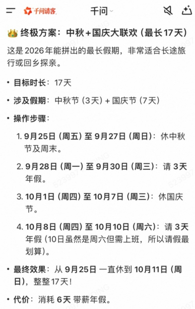 對(duì)此,千問官方表示,雖然滿足了網(wǎng)友們的請(qǐng)假條需求,但還是建議朋友們直面人終究還是要上班的現(xiàn)實(shí)。如果實(shí)在不想上班,還可以嘗試將今年中秋、國(guó)慶假期和年假拼成17天超長(zhǎng)假期,實(shí)現(xiàn)從9月25日到10月11日連休17天的“拼好假”。