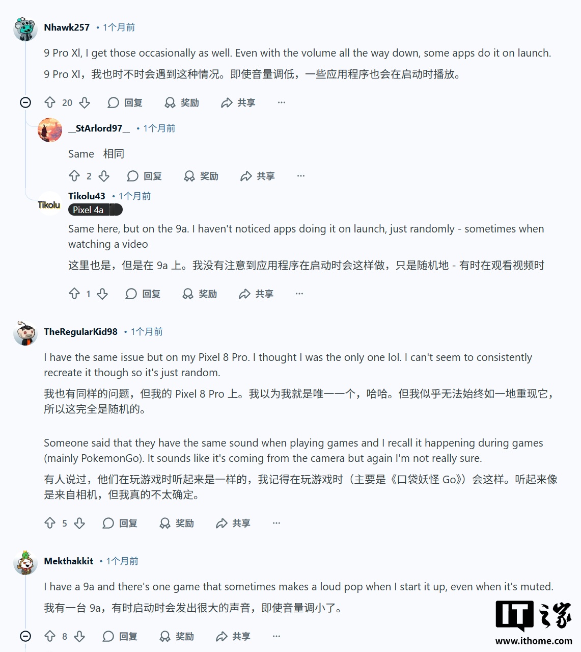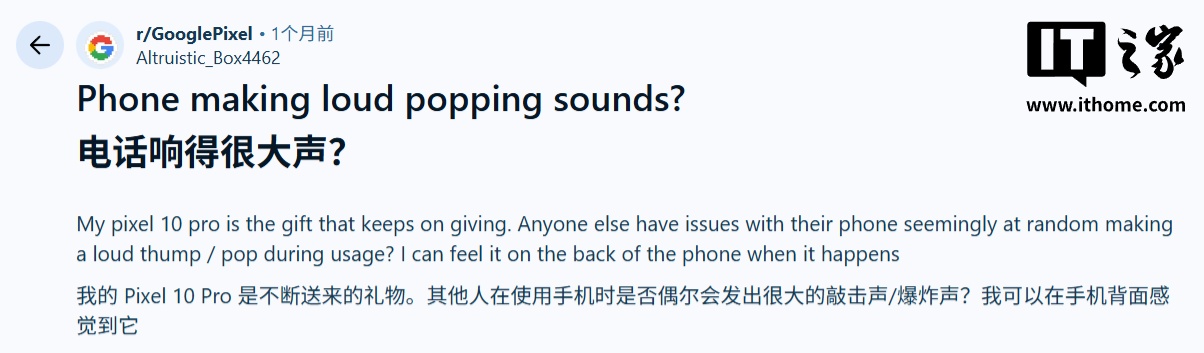 根據(jù)多名用戶在 Reddit 社區(qū)發(fā)文,這些爆音是隨機出現(xiàn)的,而且音量飄忽不定有時候可能會相當(dāng)響,隨后有許多用戶在評論區(qū)表示,自己的 Pixel 10 Pro、Pixel 9、Pixel 8 和 Pixel 7 都遇到了類似問題,表明這種故障并非局限于某一款機型。