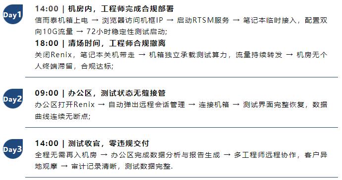 RTSM價(jià)值:白天配置啟動(dòng),夜間機(jī)箱自主運(yùn)行,次日遠(yuǎn)程驗(yàn)收,合規(guī)前提下完成72小時(shí)壓力驗(yàn)證。
