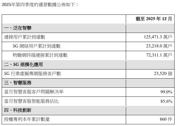 數(shù)據(jù)顯示,2025年第四季度,中國聯(lián)通聯(lián)接用戶總數(shù)達到12.54713億戶,物聯(lián)網(wǎng)終端連接累計達7.23111億戶,5G行業(yè)虛擬專網(wǎng)服務(wù)客戶數(shù)達23520個,當(dāng)月智慧客服客戶問題解決率達99%,當(dāng)月智慧客服智能服務(wù)占比達85.6%,授權(quán)專利本年累計數(shù)量達860件。