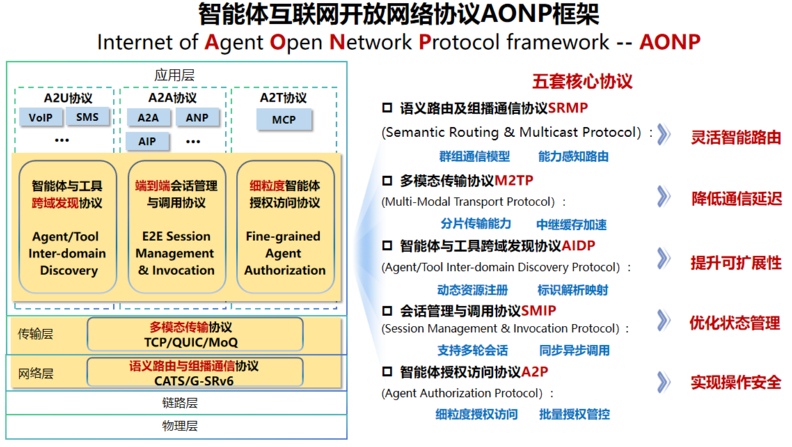 五項(xiàng)協(xié)議構(gòu)成協(xié)議簇框架,從網(wǎng)絡(luò)基礎(chǔ)能力優(yōu)化、端到端、跨域通信保障等維度為多智能體互聯(lián)協(xié)作提供了更全面的能力組合。