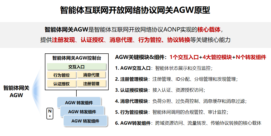 此外,中國(guó)移動(dòng)研究院自主研發(fā)了AONP協(xié)議框架實(shí)現(xiàn)的核心載體——智能體網(wǎng)關(guān)AGW原型,包括“1+4+N”核心模塊和組件。1個(gè)網(wǎng)關(guān)核心交互入口,注冊(cè)管理、認(rèn)證授權(quán)、消息代理、行為管控4大管控模塊,以及N個(gè)可分布部署在開放網(wǎng)絡(luò)環(huán)境中的AGW轉(zhuǎn)發(fā)組件。智能體網(wǎng)關(guān)AGW通過中心與分布式協(xié)同控制實(shí)現(xiàn)AONP協(xié)議關(guān)鍵能力,使能智能體互聯(lián)網(wǎng)全域互聯(lián)、高效管控與安全運(yùn)行。