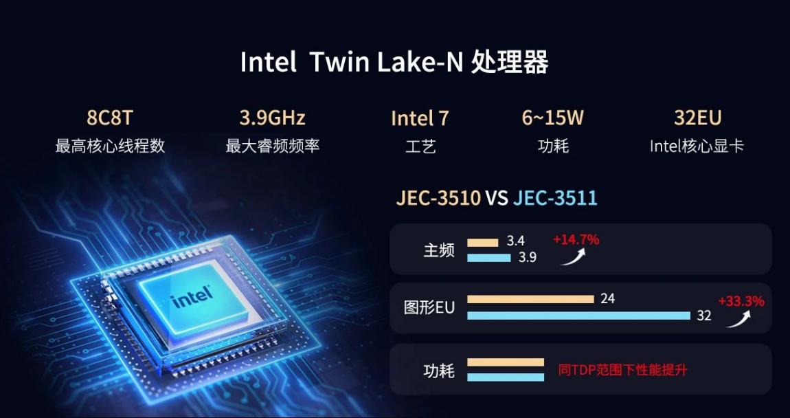 JEC-3511通用型工業(yè)BOX整機搭載全新一代英特爾®新一代 Twin Lake-N 處理器,相較Alder Lake-N平臺,AI推理性能提升40%。采用先進Intel 7制程工藝,在主頻提升至3.9GHz的同時,整體功耗降低約15%,實現(xiàn)性能與能效的雙重優(yōu)化。