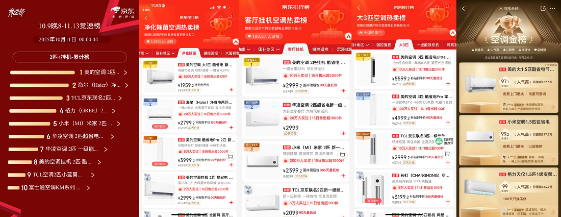 市場(chǎng)數(shù)據(jù)也印證了這一點(diǎn),奧維云網(wǎng)(AVC)統(tǒng)計(jì)顯示,約42%的消費(fèi)者表示,愿意為“長(zhǎng)期節(jié)省電費(fèi)”而選擇更節(jié)能的產(chǎn)品。節(jié)能、健康、智能互聯(lián)已成為驅(qū)動(dòng)產(chǎn)品換新的三大核心訴求。這意味著,一臺(tái)好空調(diào)的標(biāo)準(zhǔn),已從基礎(chǔ)制冷制熱,升級(jí)為一項(xiàng)關(guān)乎未來數(shù)年生活品質(zhì)與成本的“長(zhǎng)期投資”。這一趨勢(shì)在銷售端尤為明顯,今年雙十一京東首開28小時(shí),美的空調(diào)整體銷售額爆發(fā),其中“酷省電”系列在“2 匹 + 掛機(jī)累計(jì)榜”、“凈化除菌空調(diào)熱賣榜”、“大三匹掛機(jī)空調(diào)熱賣榜”等多榜單銷量登頂,成為當(dāng)之無愧的“消費(fèi)風(fēng)向標(biāo)”。