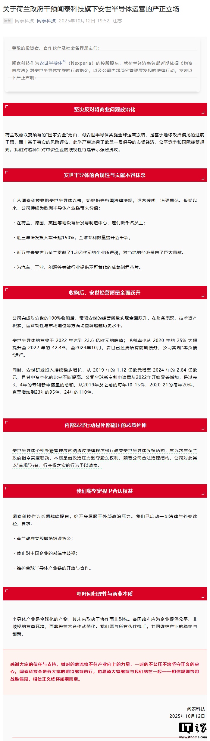據(jù)IT之家此前報(bào)道,聞泰科技 10 月 12 日發(fā)布公告,荷蘭政府 9 月 30 日發(fā)出指令,要求凍結(jié)聞泰科技的控股子公司安世半導(dǎo)體對(duì)資產(chǎn)、知識(shí)產(chǎn)權(quán)等進(jìn)行調(diào)整,為期一年。