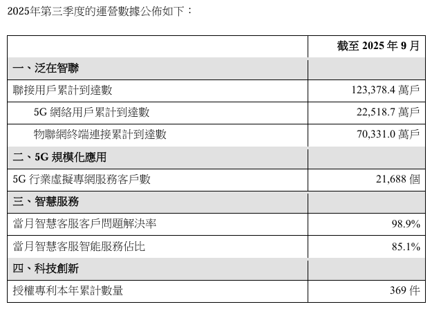 數(shù)據(jù)顯示,2025年第三季度,中國聯(lián)通聯(lián)接用戶總數(shù)達到12.33784億戶,物聯(lián)網(wǎng)終端連接累計達7.0331億戶,5G行業(yè)虛擬專網(wǎng)服務(wù)客戶數(shù)達21688個,當(dāng)月智慧客服客戶問題解決率達98.9%,當(dāng)月智慧客服智能服務(wù)占比達85.1%,授權(quán)專利本年累計數(shù)量達369件。