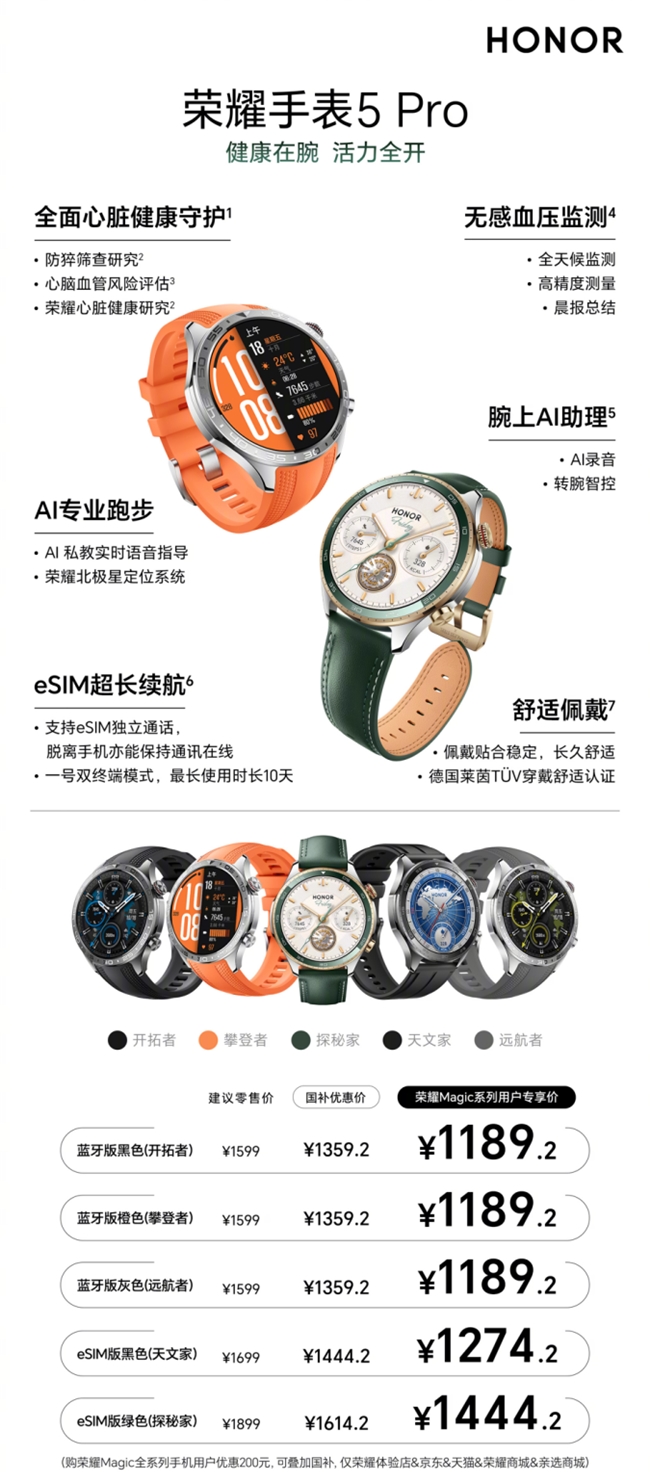 榮耀手表5 Pro自9月25日全渠道啟動預(yù)售以來,市場反響熱烈,上市初期一度全渠道售罄,出現(xiàn)斷貨的熱銷盛況。10月23日,榮耀手表5 Pro正式開啟首銷,有藍(lán)牙和eSIM兩個版本可選,其中藍(lán)牙版本,攀登者(橙色)、開拓者(黑色)、遠(yuǎn)航者(灰色)首銷國補(bǔ)優(yōu)惠價1359.2元。eSIM版本,天文家(黑色)首銷國補(bǔ)優(yōu)惠價1444.2元,探秘家(綠色)首銷國補(bǔ)優(yōu)惠價1614.2元。首銷期榮耀Magic系列用戶,攀登者、開拓者、遠(yuǎn)航者專享國補(bǔ)優(yōu)惠價1189.2元,天文家專享國補(bǔ)優(yōu)惠價1274.2元,探秘家專享國補(bǔ)優(yōu)惠價1444.2元。