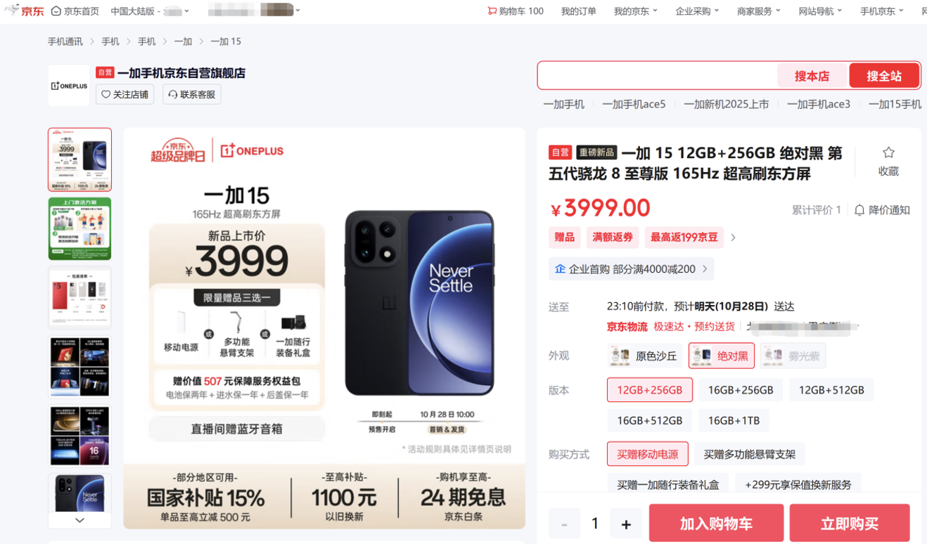 10月27日,一加 15和一加 Ace 6正式發(fā)布,其中,一加 15售價3999元起,將于10月28日10:00正式開售;一加 Ace 6售價2599元起,將于10月30日10:00正式開售。為帶給消費者更多權(quán)益,京東攜手一加打造先人一步加速換新計劃,提供限量一加 15和一加 Ace 6現(xiàn)貨優(yōu)先發(fā)貨,最快發(fā)布會后半小時送達,且先人一步下單指定版本一加 15限量加贈京東PLUS會員京典年卡,先人一步下單指定版本一加 Ace 6限量加贈一加編織游戲數(shù)據(jù)線。到京東APP搜索“一加超能玩家”進入互動游戲活動頁,參與游戲贏一加新機、耳機、無畏契約官方周邊、京東外賣券等,其中10月27日至28日有機會贏30元京東外賣券。值得一提的是,發(fā)布會一加 15發(fā)布后《長安的新機》創(chuàng)意視頻上線,由B站up主7鯨尾出演新機使,和一加社區(qū)負責人藍帥一起為京東先人一步用戶送達一加 15,京東秒送最快半小時達。