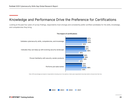 面對持續(xù)存在的人才短缺困境,專業(yè)認證的價值持續(xù)獲得業(yè)界認可。89%的IT決策者更傾向于雇用持有專業(yè)認證的候選人,認為認證能有效驗證知識儲備(67%)、體現(xiàn)技術(shù)適應(yīng)能力(61%)并證實對關(guān)鍵工具的熟練度(56%)。然而,與此趨勢相悖的是,企業(yè)對認證資助的投入在2024年出現(xiàn)縮減,僅有73%的受訪者表示愿意為員工支付認證費用,低于2023年的89%。