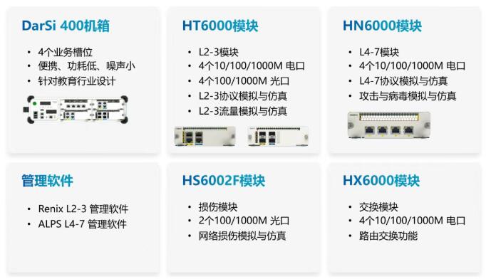 包括L2-3模塊,L4-7模塊,網(wǎng)絡(luò)損傷模塊,三層交換模塊。通過(guò)靈活配置這些模塊,可以滿足通信網(wǎng)絡(luò)與網(wǎng)絡(luò)安全專業(yè)教學(xué)中各種實(shí)驗(yàn),從而達(dá)到深挖網(wǎng)絡(luò)原理,貼近教學(xué)實(shí)踐的目的。
