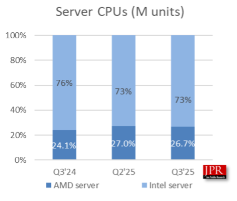 JPR:全球客戶端 CPU 市場(chǎng) 2025Q3 環(huán)比增長(zhǎng) 2.2%、同比下降 2.2%