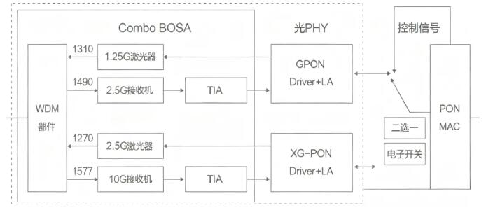 我們首先簡單來看一下Combo FTTR器件技術(shù):與傳統(tǒng)GPON BOSA或10G PON BOSA相比,F(xiàn)TTR+上聯(lián)接口BOSA通過內(nèi)部WDM將收發(fā)功能進行合分波集成,形成小型化Combo光器件。這種設(shè)計優(yōu)化了器件結(jié)構(gòu),提高了集成度。同時,BOB方案的應(yīng)用使得光PHY與MAC直接相連,簡化了信號處理流程。一個Combo PON BOSA同時包含了GPON和10G PON的兩個物理通道,為FTTR主設(shè)備提供了豐富的物理接口選擇。