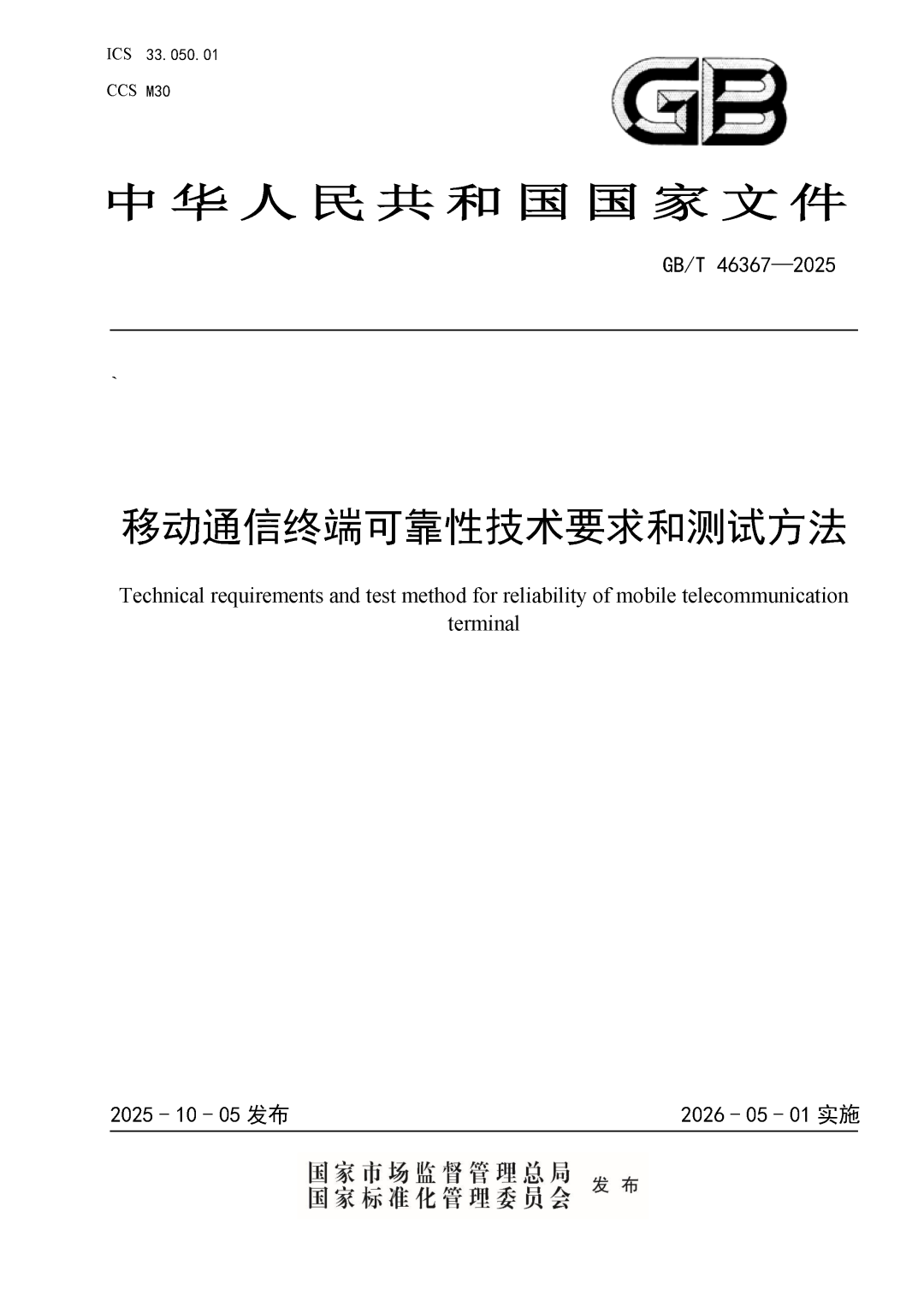 11 月 20 日消息,據(jù)泰爾終端實驗室今日消息,2025 年 10 月 5 日,由中國信息通信研究院(簡稱“中國信通院”)牽頭制定的移動通信終端可靠性國家標準 GB/T 46367-2025《移動通信終端可靠性技術要求和測試方法》正式發(fā)布,將于 2026 年 5 月 1 日起全面實施。