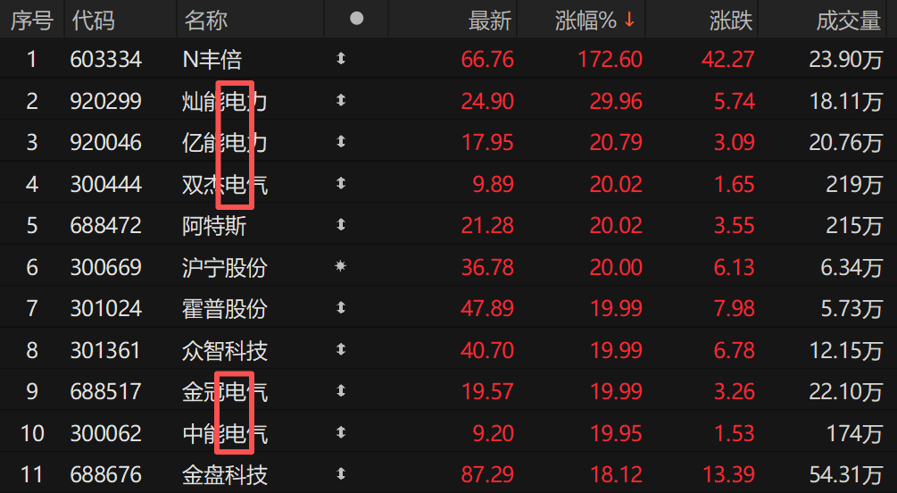 電力設(shè)備概念股集體爆發(fā),包括雙杰電氣(9.890, 0.00, 0.00%)、特變電工(24.110, 0.00, 0.00%)、保變電氣(9.910, 0.00, 0.00%)、太陽電纜(7.240, 0.00, 0.00%)在內(nèi)共計(jì)十余股漲停?v觀今日漲幅榜,多只證券簡稱中含有“電”字的個(gè)股位居前列。