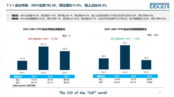 2025年上半年,中國會(huì)議平板市場(chǎng)總出貨量19.23萬臺(tái),同比增長(zhǎng)11%,需求持續(xù)釋放。然而,市場(chǎng)呈現(xiàn)深刻的“量?jī)r(jià)分化”:線上渠道以46.3%的出貨量貢獻(xiàn)了23%的銷售額,是普及主力;線下渠道則以53.7%的出貨量,支撐了77%的銷售大盤,成為價(jià)值核心。