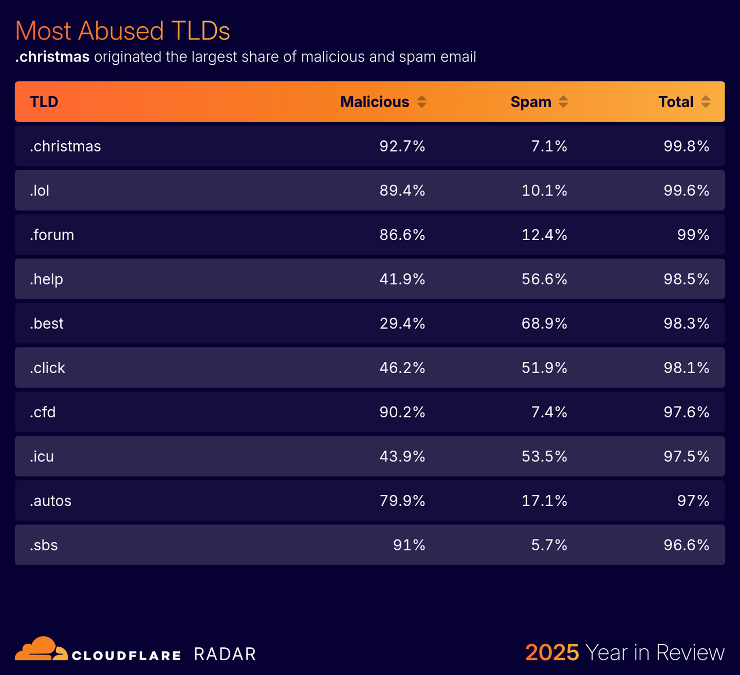 .christmas 和.lol 頂級域名發(fā)送的郵件中 99% 為垃圾或惡意郵件