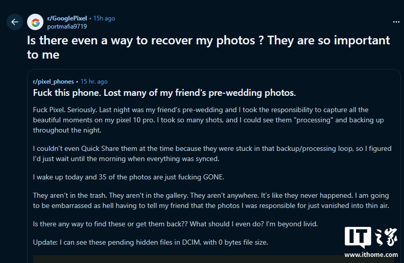 數(shù)月前,用戶 Blazgamer 在 Reddit 的 r/GooglePixel 子版塊發(fā)帖稱,其在旅行途中用 Pixel 9 拍攝的照片全部消失。就在今日早些時(shí)候,用戶 portmafia9719 也表示自己的 Pixel 10 Pro 遇到了類似問(wèn)題。目前尚不清楚這些照片發(fā)生了什么,但一個(gè)共同的情況似乎是,手機(jī)曾長(zhǎng)時(shí)間彈出“照片正在后臺(tái)處理”的通知,之后照片便不見了蹤影。