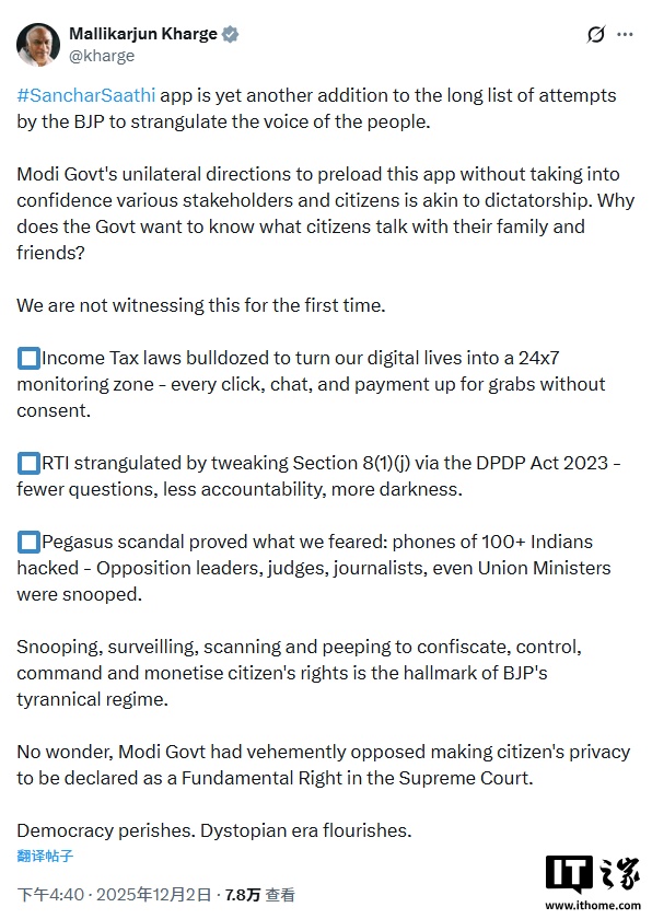 此項強(qiáng)制安裝令此前引發(fā)強(qiáng)烈爭議。反對黨國大黨領(lǐng)袖馬利卡瓊・卡爾格(Mallikarjun Kharge)周二在 X 平臺上發(fā)文稱,此舉將導(dǎo)致“窺探、監(jiān)視、掃描和偷窺”,并形容其“近乎獨(dú)裁”。