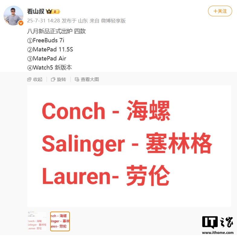 7 月 31 日消息,博主 @看山叔 今天在微博透露,華為將在八月發(fā)布四款新品。