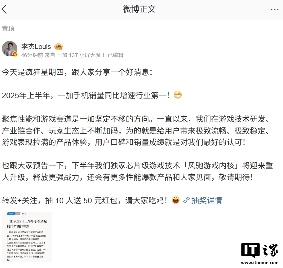 一加手機(jī) 2025 上半年銷量同比增速行業(yè)第一,“風(fēng)馳游戲內(nèi)核”下半年重大升級