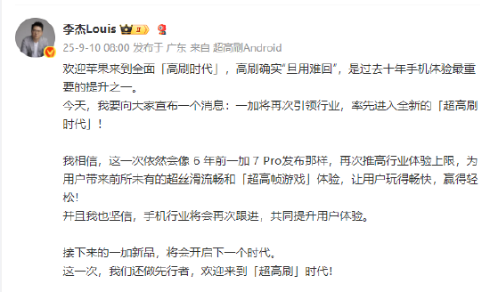 9月10日消息,一加中國區(qū)總裁李杰今日微博發(fā)文稱,歡迎蘋果來到全面‘高刷時代’。他表示,高刷確實“但用難回”,是過去十年手機體驗最重要的提升之一。