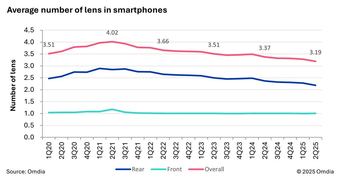 Omdia:智能手機(jī)攝像頭數(shù)量持續(xù)下降,2025Q2 新機(jī)平均配備 3.19 個(gè)